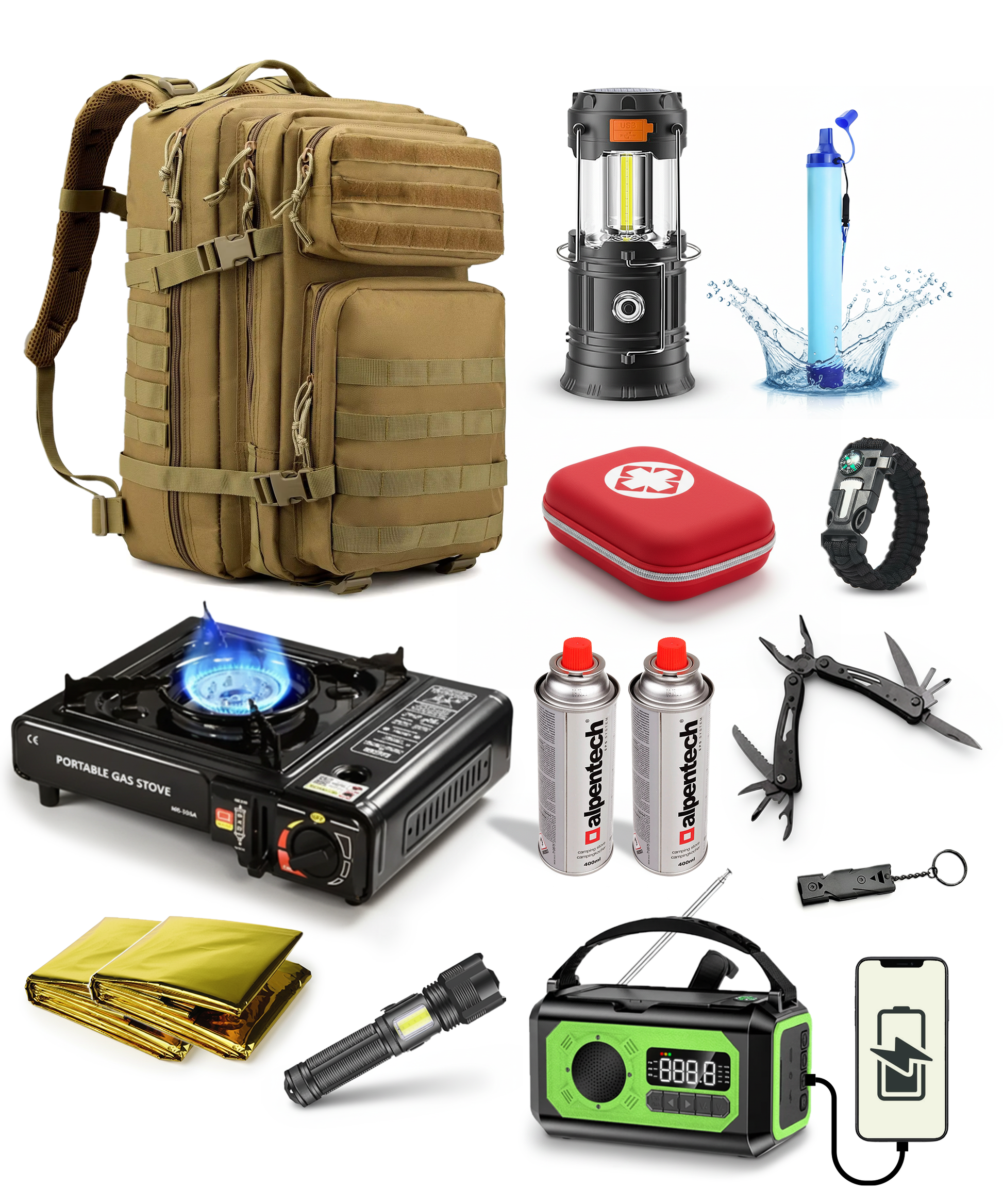 Wees altijd voorbereid met dit complete 12-delige noodpakket. Ideaal voor kamperen, wandelen, vissen, reizen, stroomuitval of echte noodsituaties. De set bevat alle essentiële tools om warm te blijven, te communiceren, licht te creëren, veilig water te drinken en te koken, waar je ook bent!