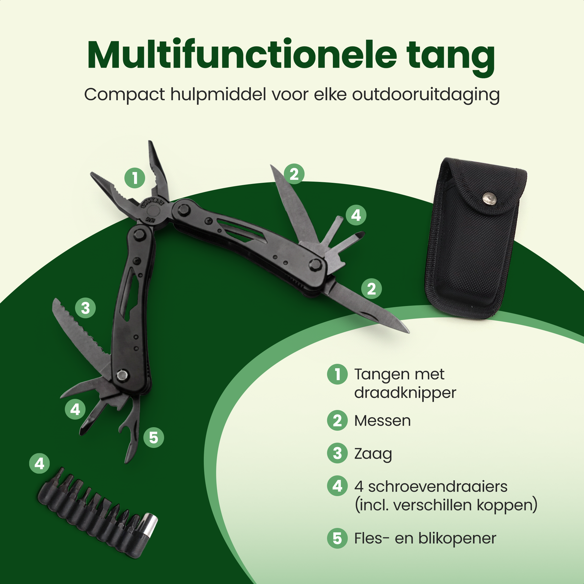 Multifunctionele tang – met messen, zaag, schroevendraaiers en opener.