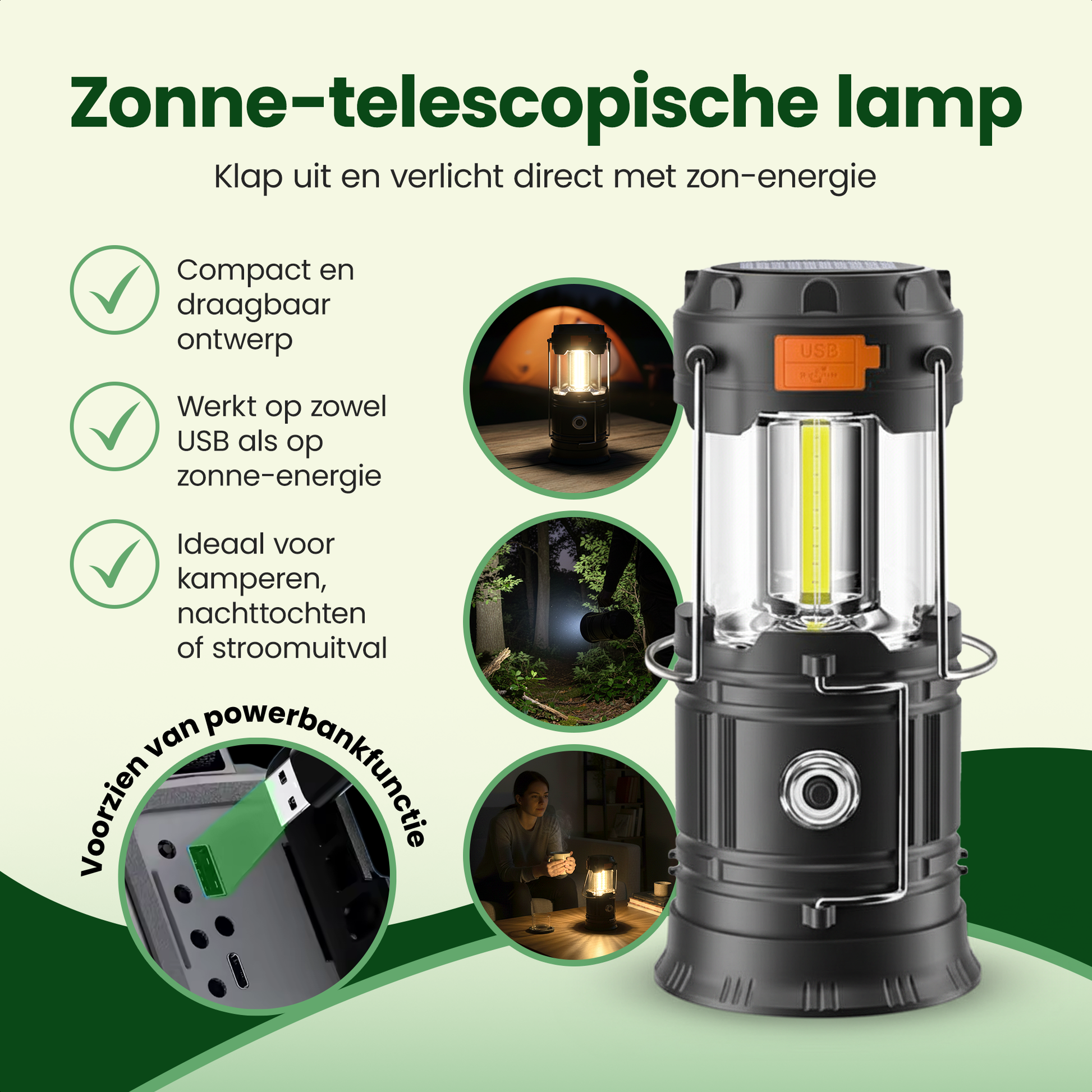 Zonne-telescopische lamp – opvouwbaar en werkt op zonne-energie of USB (kan ook als powerbank functie gebruikt worden).