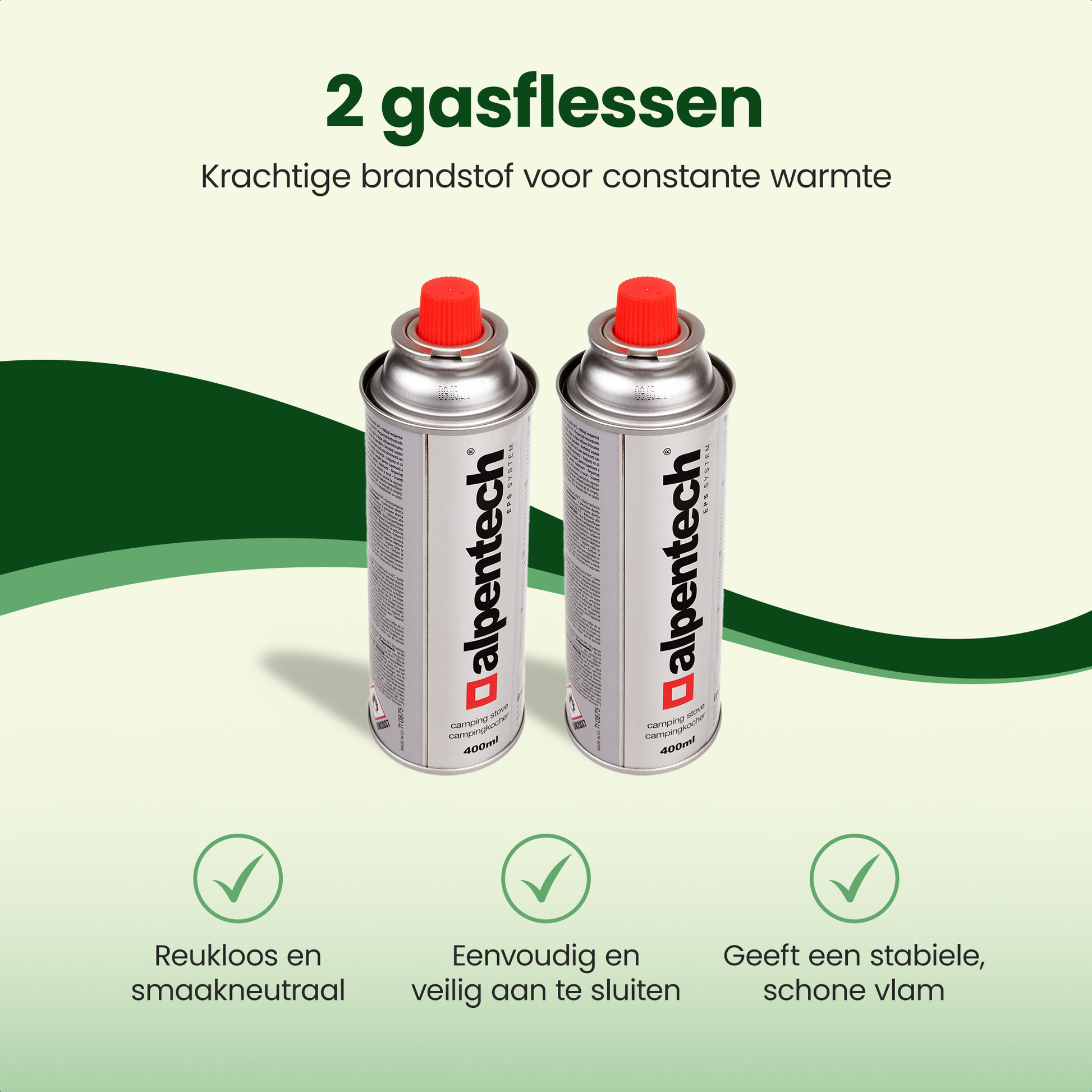 2 Gasflessen – krachtige brandstof voor een constante, schone vlam, eenvoudig en veilig aan te sluiten.